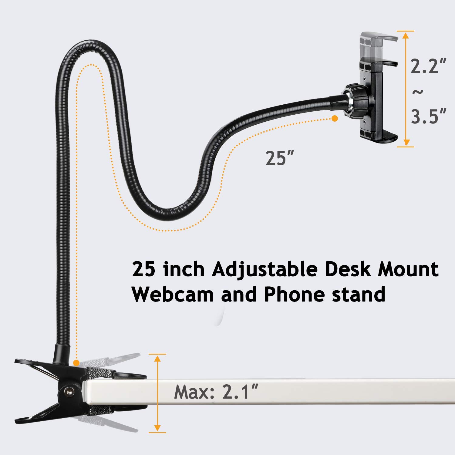 Webcam stand and phone holder amada 25 inch flexible arm 360 desk or bed gooseneck mount stand for cell phone 11 pro xs max xr x 8 7 6 plus and logitech c925e c922x c930e c922 c930 c920 c615 brio.